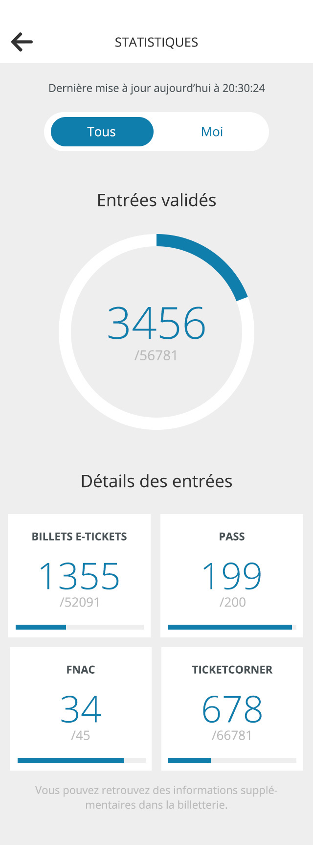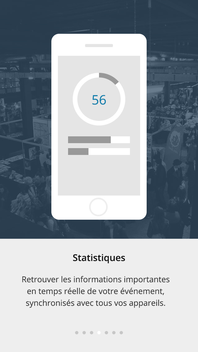 Les statistiques affichent le nombre d’entrées validés pour l’appareil ou pour tous les appareils synchronisés ce qui est pratique pour les organisateurs en leur donnant une idée du nombre de personne qui sont à l’événement. De plus avoir des statistique par appreil permet aussi de pouvoir comparer entre les appareils.