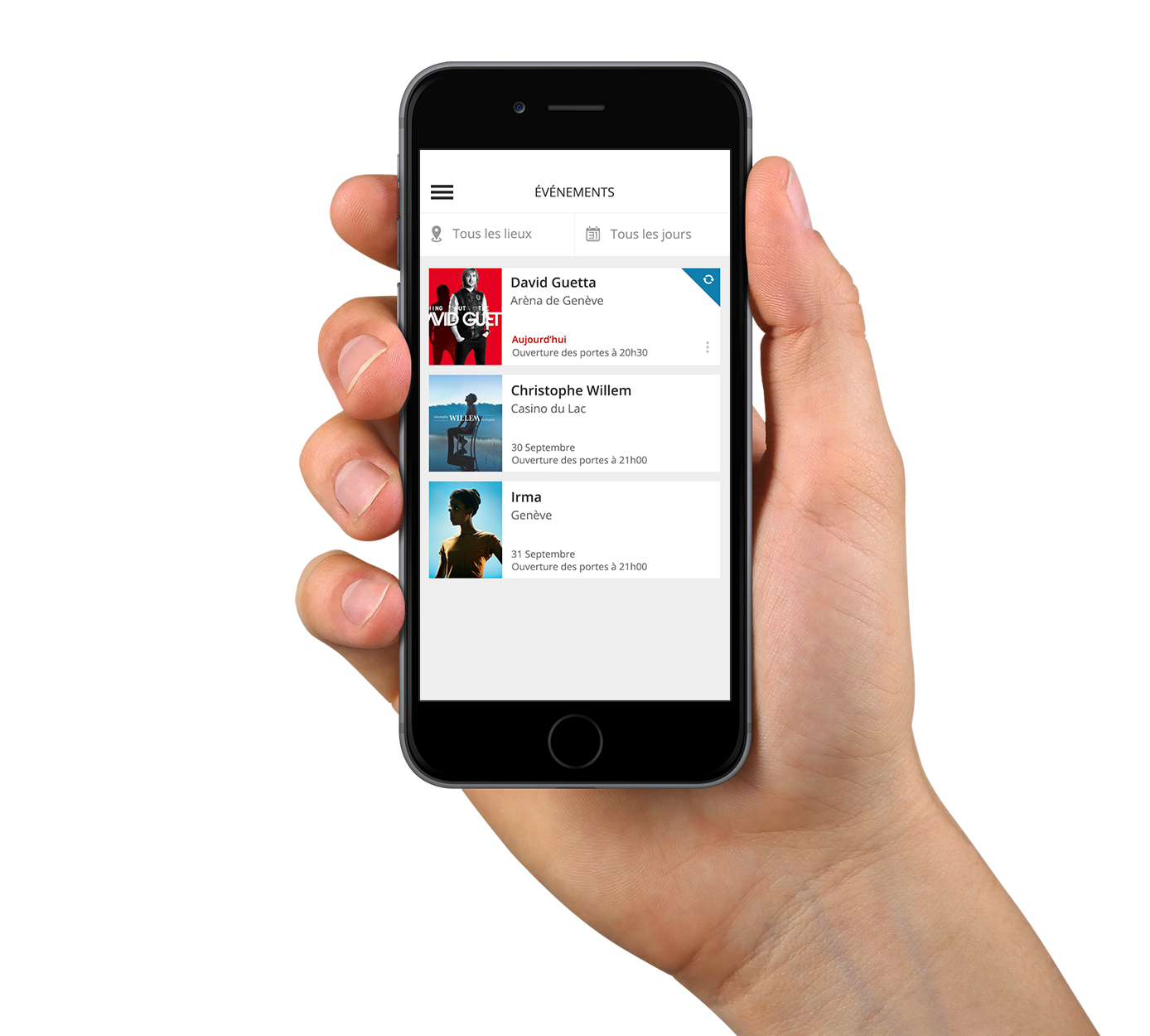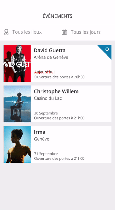 Pour éviter au maximum que les organisateurs perdent du temps à chercher l’événement qu’ils souhaitent contrôler, les événements sont triés par le plus proche dans la date en premier. Ce qui sont le jour même sont mis en évidance. De plus, il y a aussi un système de filtre par lieux ou par jour et pour terminer une recherche en tirant le contenu par le bas.